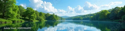 A tranquil scene of a peaceful lake surrounded by lush green trees, reflecting the clear blue sky and fluffy white clouds above , lake, beauty