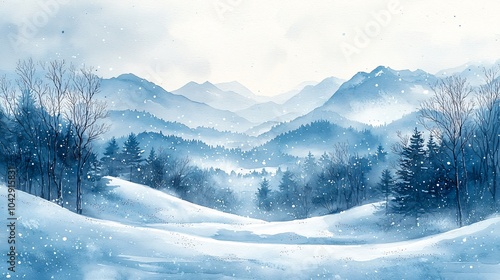 christmas, winter, snowfall, tranquil, watercolor, serene, holiday, blue, white, grey, calm, peaceful, nature, cold, seasonal, copy space, soft light, reflective, mist, hill, tree, mountain, calmness, winter landscape, white christmas, snowflake, winter scenery