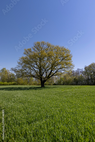 growing, field, green, wheat, tall, old, oak, lone, late, spring, sky, blue, summer, season, 1, nature, meadow, environment, tree, big, strong, tree branch, deciduous tree, empty, growth, scene, young, background, alone