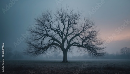 A Tree Without Leaf seen against a foggy sky at dusk or dawn.
