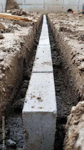 trench, block, dirtied, construction, foundation, building, level, alignment, excavation, concrete, masonry, material, site, preparation, gravel, dirt, framework, support, structure, landscape, tool, equipment, safety, project, labor, hard hat, men at work, depth, measurement, design, engineering, layout, area, space, terrain, earth, surface, precision, placement, installation, work, progress, stability, durability, architecture, planning