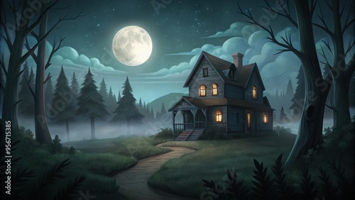 house, home, building, structure, forest, tree, wood, night, moonlight, moon, full, sky, star, dark, fog, misty, foggy, path, trail, grass, lawn, yard, porch, window, light, glowing, skittish, creepy, mysterious, eerie, scarey, landscape, nature, scenery, silhouette, illustration, cartoon, digital, art, artwork
