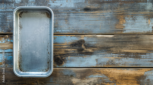 A used empty metal baking tray sits on a rustic wooden table, highlighting its worn texture.