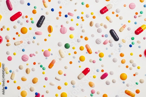 A Variety of Colorful Pills and Capsules Scattered on a Clean White Background, Health