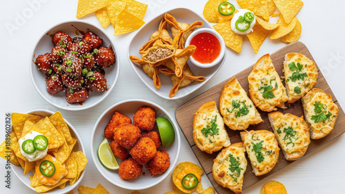 snack, appetiser, tasty, variety, party food, buffet, nacho, spicey, cheesy, finger food, garnish, fresh, savoury, entertaining, salsa, crunchy, crispy, flavorful, cheese, bread, breadstick, sliced, assorted, platter, dining, social gathering, catering, garnished