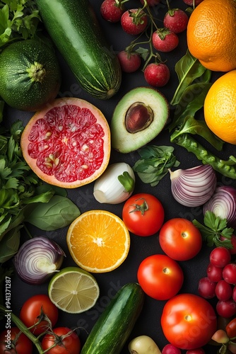A variety of fresh vegetables and fruits including avocado, citrus, and tomatoes placed artistically on a dark table.