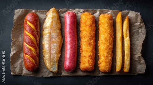 A Variety of Fried and Grilled Sausages, Fish, and Croquettes Arranged on Crumpled Brown Paper for an Eye-Catching Food Presentation