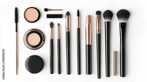 A variety of makeup brushes and cosmetics arranged neatly on a white background for beauty enthusiasts and professionals