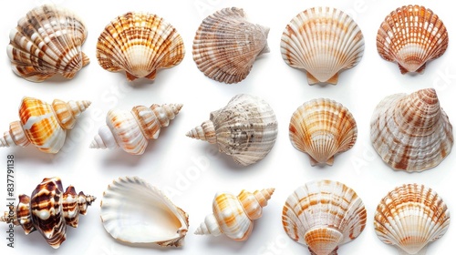 a variety of seashells on a white background