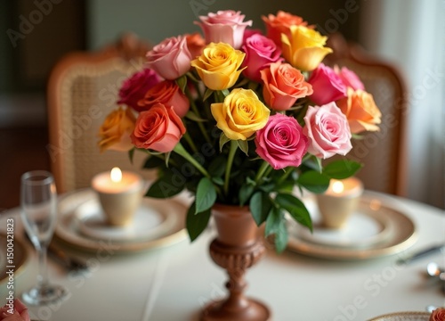 A vase filled with pink and yellow roses sitting on a table.