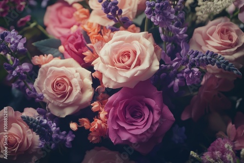 A vase of pink, purple and orange roses with lavender accents. A beautiful floral arrangement for events or as a thoughtful gift.