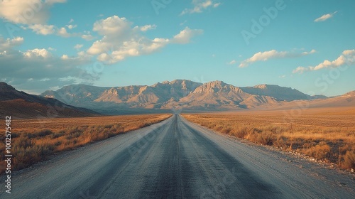 a vast empty road leading towards a rugged mountain range in a desert landscape, perfect for a scenic adventure, embracing the solitude and open wilderness of the remote environment