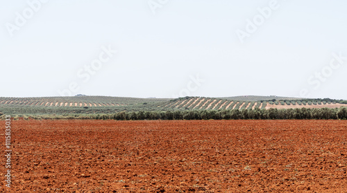 A vast, reddish-brown plowed field stretches towards a distant farmhouse surrounded by olive groves, with rolling hills and mountains in the background under a clear blue sky.