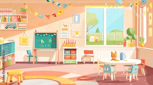 classroom, kindergarten, class, room, vector, empty, interior, children, furniture, school, flat, stationery, background, icon, design, tree, illustration, table, concept, cartoon, education, children, children, cute, painting, balloon, game, desk, drawing, crayons, fun, learning, toy, cube, childhood, equipment, preschool, chair, playground, childcare center, elementary, back, indoor, play, playroom, playschool