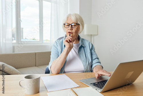a very serious, stylish, elderly woman is sitting at home at her laptop and working intently with her hand near her face, with notebooks for notes on the table