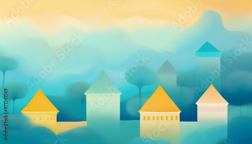 abstract, village, rooftop, colourful, misty, soft, warm, blue, yellow, building, house, landscape, pastel, artistic, serene, peaceful, gradient, whimsical, calm, scenery, fantasy, dreamy, sky, tree, nature, community, design, creative, sunset, vibrant, tranquil, illustration, harmony, architecture, minimal, playful, surreal, countryside, layer, airy, background, environment
