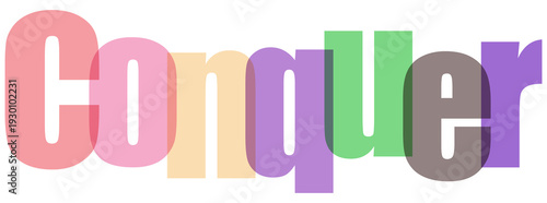 A vibrant and colorful word art spelling conquer with various shades and hues