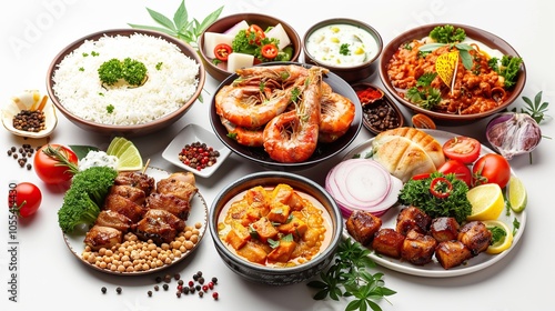 A vibrant and flavorful spread of Indian cuisine featuring a variety of dishes, including shrimp, chicken, curry, rice, and vegetables.
