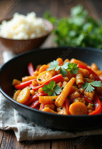 healthy, vegetarian, lunch, dinner, carrot, red pepper, savoury, bowl, homemade, receipe, culinary, food photography, closeup, parsley, garnish, comfort food, italian cuisine, delicious, tasty, appetising, wooden table, satisfying, flavorful, kitchen, cooking, home cooking, wholesome, vibrant, saucy, dining, light meal, alimentary, rustic, colourful