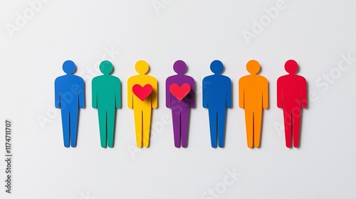 A vibrant and meaningful paper cutouts of human figures arranged neatly in a line. Paper cuts of people in rainbow colors holding hands side by side with all of them with a heart shape on them