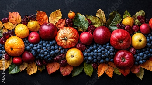 fruit, apple, pumpkin, berry, grape, leaf, autumn, harvest, nature, colourful, food, seasonal, healthy, organic, fresh, arrangement, decoration, vibrant, aesthetic, ripe, sweet, tart, variety, texture, composition, display, centrepiece, natural, colours, orange, red, yellow, blue, purple, foliage, rustic, epicure, picnic, feast, nourishment, vegetarian, agriculture, garden, wholesome, edible, culinary, landscape