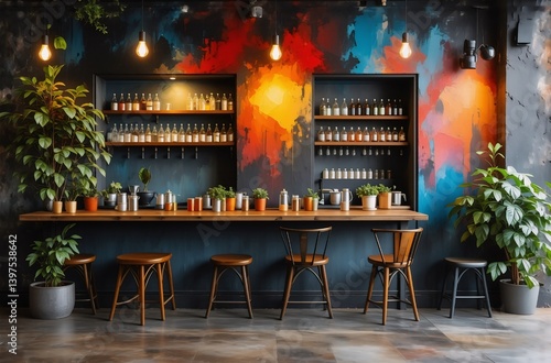 A vibrant bar interior with a colorful mural backdrop, wooden bar top, and vintage-style stools. Lush potted plants add a touch of nature to the space. The warm lighting creates a cozy atmosphere.