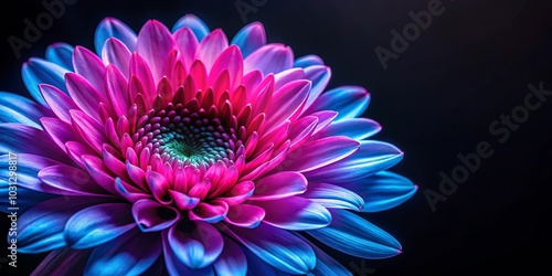 A vibrant blossom with a captivating blend of magenta and azure, radiating beauty against a deep black backdrop.