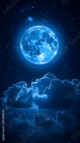 A vibrant blue moon dominates a night sky speckled with stars and partially obscured by fluffy clouds below