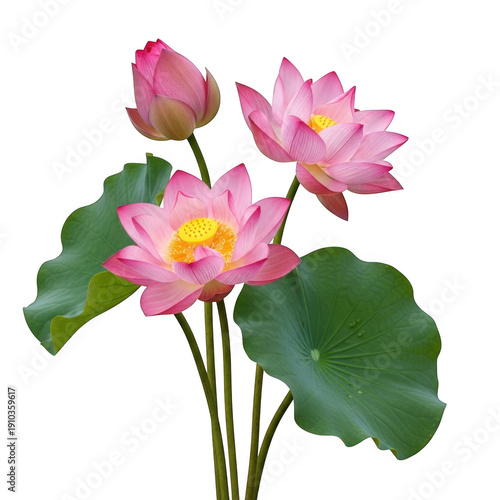 A vibrant bouquet of pink lotus flowers blooming in a serene pond setting. isolated on transparent background