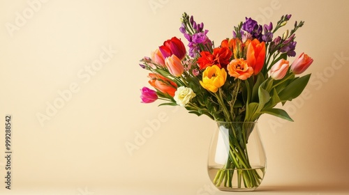 A vibrant bouquet of spring flowers in a clear vase, with a neutral background and plenty of room for text