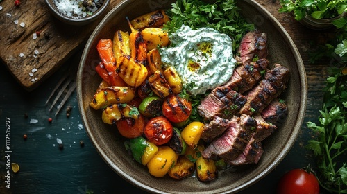 A vibrant bowl featuring grilled vegetables, succulent steak, and a creamy dip, garnished with fresh herbs, showcasing a delicious and healthy meal.