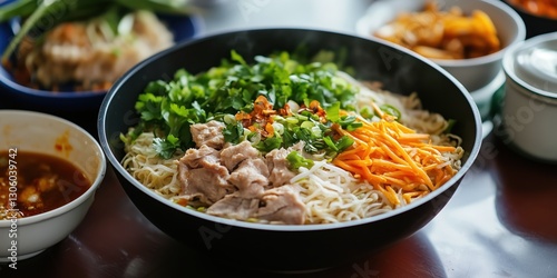 noodle, hearty, fresh, bowl, culinary, vibrant, garnish, herb, life events, food, cookery, delicious, meal, favor, savoury, meat, crunch, texture, satisfaction, creativity, steaming, warmth, culture, comfort, nourishment, colourful, plate, epicure, asian, spice, dining, indulgence, authentic, wellness, healthy, tradition