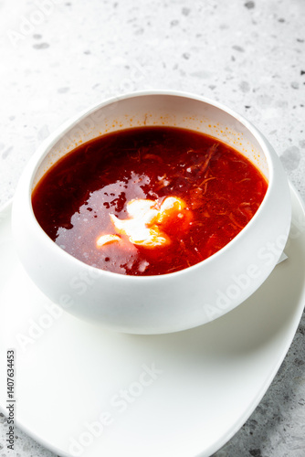 A vibrant bowl of rich red soup, featuring finely shredded ingredients and a dollop of cream on top, elegantly presented on a minimalistic white plate.