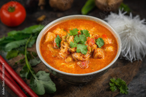 A vibrant bowl of spicy Thai red curry featuring creamy coconut milk, fresh vegetables, and aromatic herbs. For photo presentation, food promotional