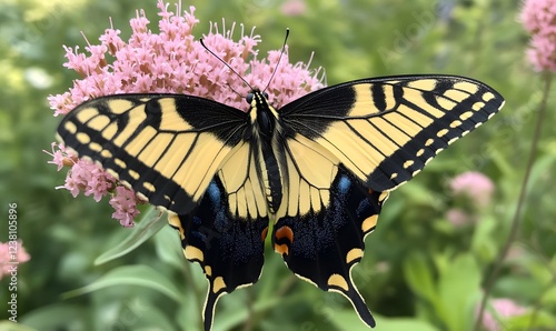 A vibrant butterfly perched on a pink flower, Generative AI
