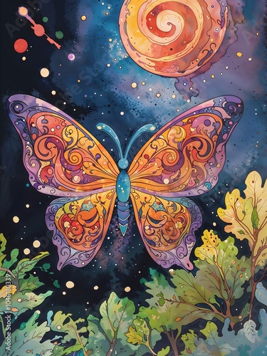 A vibrant butterfly with intricate patterns is set against a cosmic backdrop, featuring swirling celestial bodies. Bright foliage adds a touch of earthly contrast to the ethereal scene.