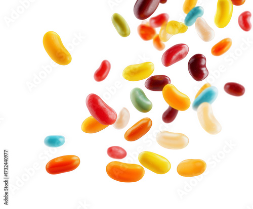 A vibrant cascade of colorful jelly beans tumbling and falling, isolated on a clean transparent background, creating a playful and sweet confectionery explosion