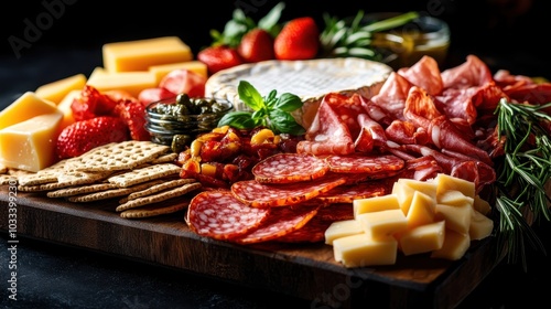 A vibrant cheese and charcuterie board enriched with fresh berries, herbs, and gourmet meat, presenting a visual feast and blend of flavors for any occasion.
