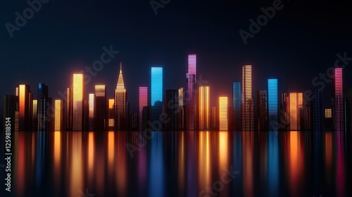 A vibrant city skyline at night, illuminated by colorful lights reflecting on water, creating a lively urban atmosphere.