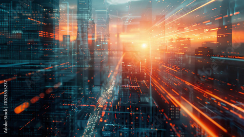 city landscape, sunset, skyscraper, urban, light, movement, energy, technology, skyline, evening, architecture, modern, vibrant, abstract, digital, futuristic, metropolis, traffic, glow, horizon, landscape, city, night, illumination, design, highrise, colourful, visual, speed, dynamic, perspective, bright, life, view, sky, glowing, light, trail, colours, art, photo, atmosphere, dynamic