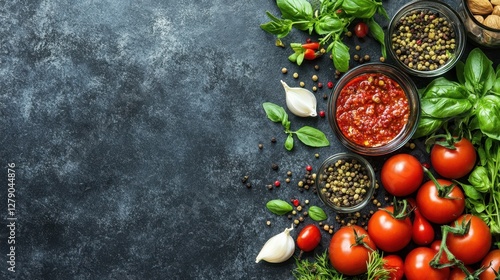 tomatoes, basil, garlic, ingredient, vegetable, food, herb, cookery, freshness, colours, table, closeup, organic, cooking, meal, preparation, seasoning, nature, nourishment, favor, healthy, epicure, produce, receipe, summer, garden, gathering, slice, dish, aroma, olive, pepper, onion, season, leaf, culinary, texture, variety, harvest, rustic, arrangement, simplicity