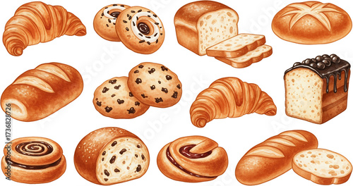bakery, baked goods, croissant, bread, cookie, donut, cinnamon roll, pastry, food, sweet, dessert, breakfast, treat, delicious, homemade, golden brown, crusty, fluffy, ingredient, baking, carbohydrate, nourishment, wheat, yeast, fresh, artisanal, confectionery, baker, appetising, variety, epicure, cafes, patisserie, cookery, hand-drawn