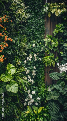 A vibrant collection of diverse plants and flowers, showcasing the beauty of nature in a lush vertical garden setup.