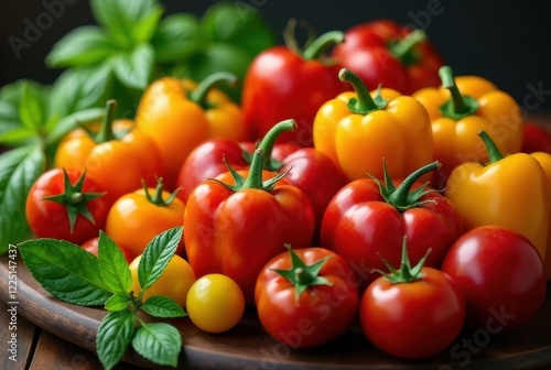 A vibrant collection of ripe red and yellow bell peppers and tomatoes, artfully arranged with fresh green herbs on a rustic wooden surface.