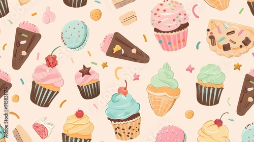 A vibrant collection of various desserts including cupcakes, ice cream cones, and cookies scattered across a soft background