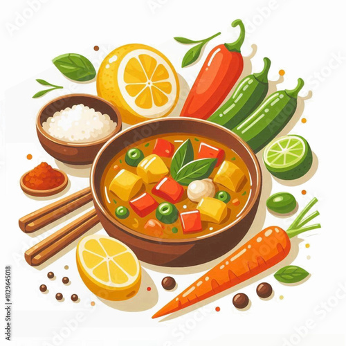 soup, lemon, vegetable, illustration, food, carrot, pepper, lime, herb, basil, rice, spice, bowl, cookery, dish, meal, vegetarian, fresh, produce, cooking, gastronomy, seasoning, garnish, healthy, diet, ingredient, red, vitamin, culinary, preparation, orange, green, brown, yellow, cut, slice, asian, favor, vegan, aromatic, delicious, appetising, nourishment, organic, plant, raw