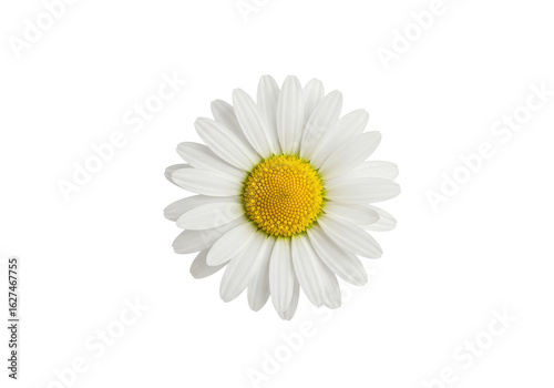 A vibrant daisy flower with white petals and a yellow center against a clean background