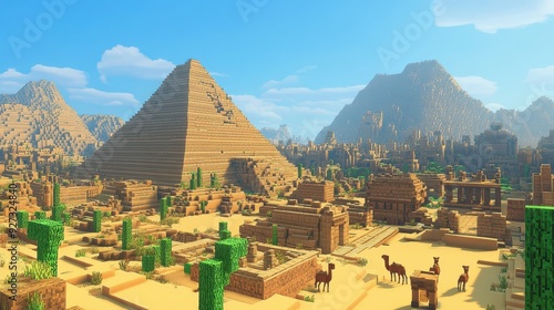 A vibrant desert landscape featuring pyramids, ancient structures, and camels in a blocky style.