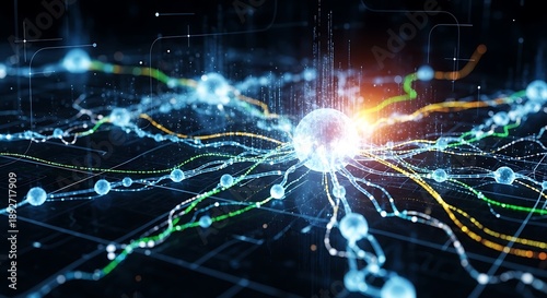technology, network, connection, digital, vibrant, glowing, neural, futuristic, science, innovation, artificial, intelligence, machine, learning, datum, visualisation, abstract, colourful, dynamic, energy, electric, pulse, circuit, board, wire, node, dot, line, grid, background, black, blue, orange, green, yellow, bright, shining, radiant, aglow, cybernetic, robotic, advanced, complex, system, structure, pattern, design