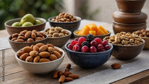 A vibrant display of assorted nuts and fruits, capturing a healthy snack choice for everyone.